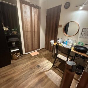 シャンプー・コンディショナー・ボディソープも髪に優しいもの、そしてシャワーを出てからのアメニティスペースでは化粧水・クリーム・ヘアケア等もサロンのものを使用されていて、リファのドライヤーとヘアアイロンと、妥協無く良いものを置いていてます。