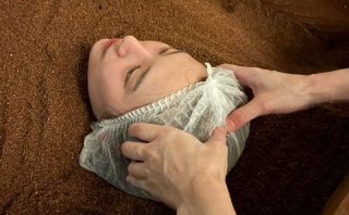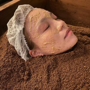 入浴後、すぐにNMNという若返り成分🤩が配合された、食べられる米ぬか酵素パックを塗っていただき、その後口元以外を全ておがで覆って、顔を温めてもらいました。