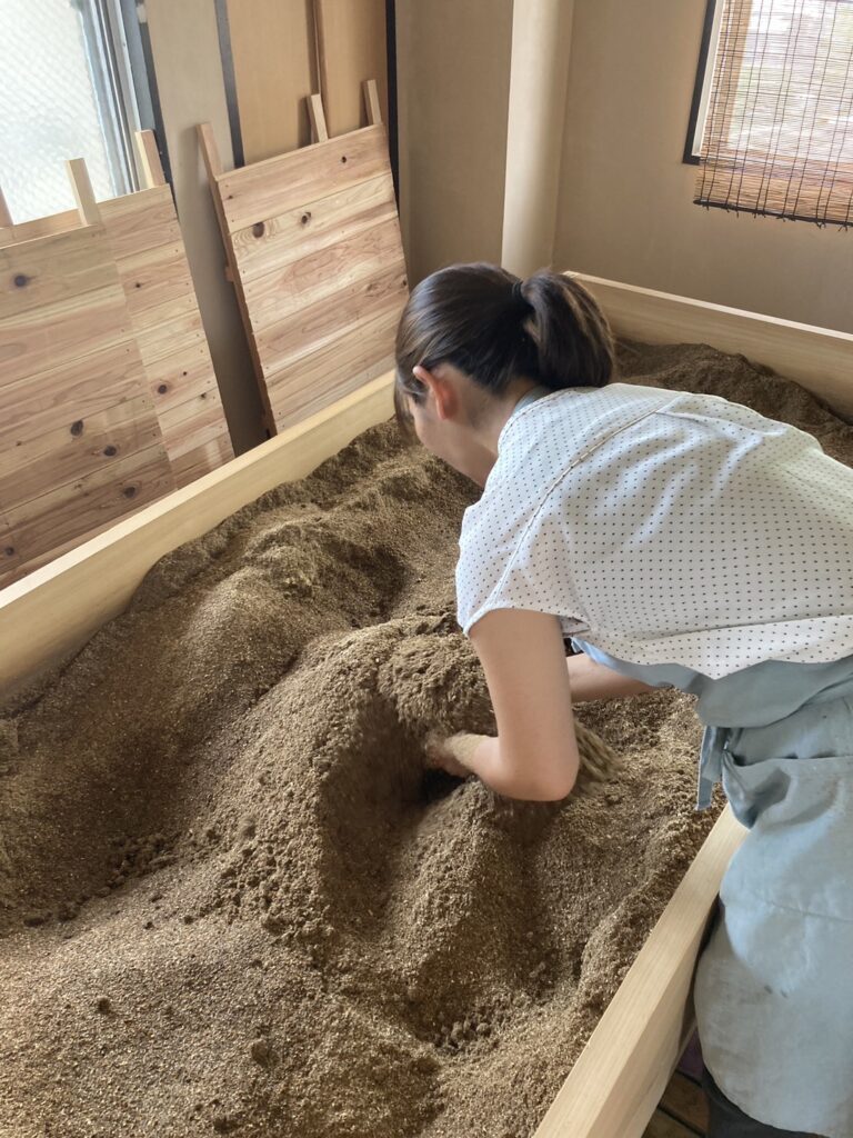 吉野の檜おが粉と古賀産米糠の酵素風呂を、毎日丁寧に素手で管理しています。一台だからこそ可能な手入れ。サラサラふわふわな酵素風呂をご体験下さい🍀